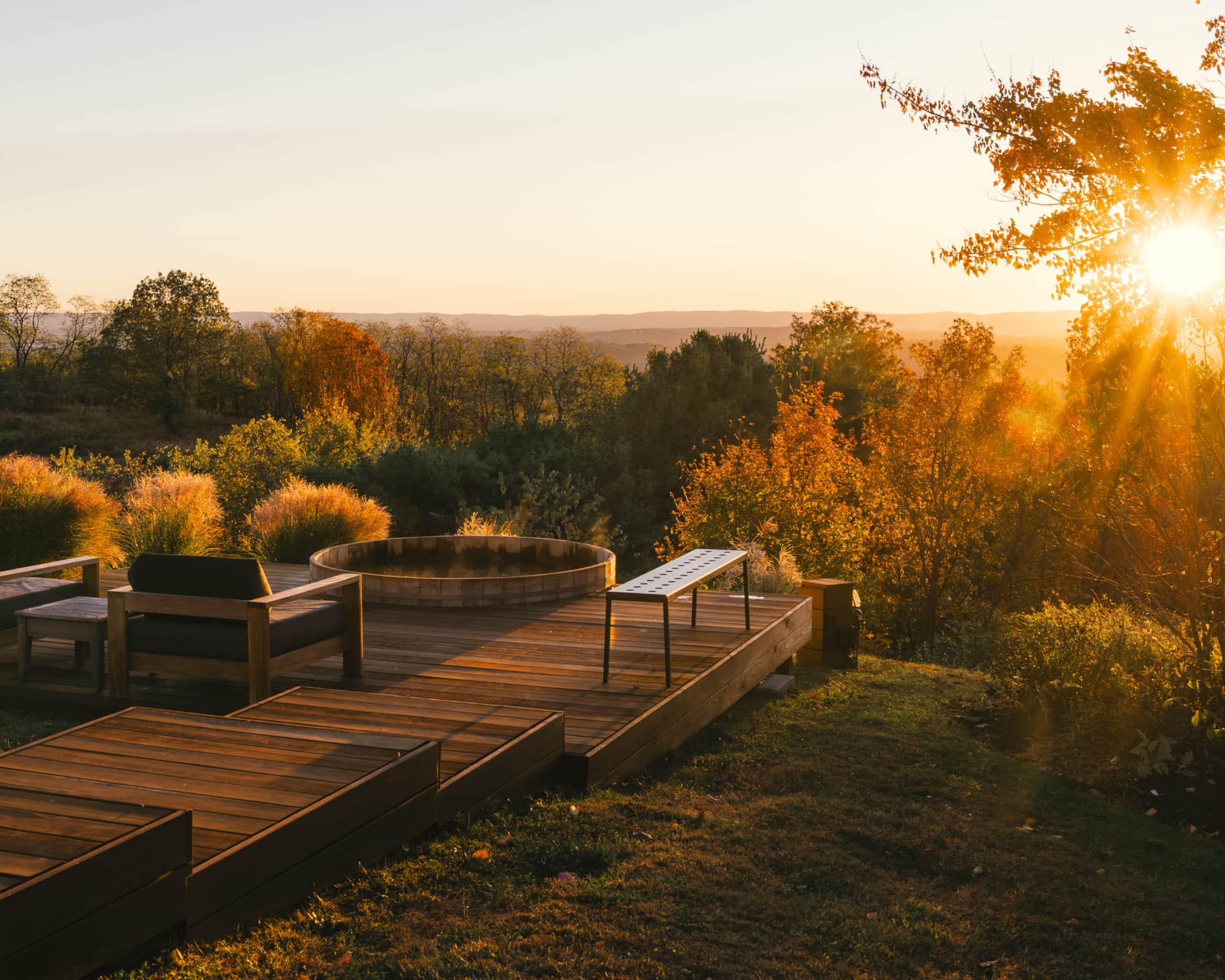 Take a bath and relax in a 104°F Japanese cedar soaking tub overlooking the Hudson Valley. Unwind feeling the warm water, smelling the soothing scent of cedar wood, and gazing into the vastness of the nature beneath you.
